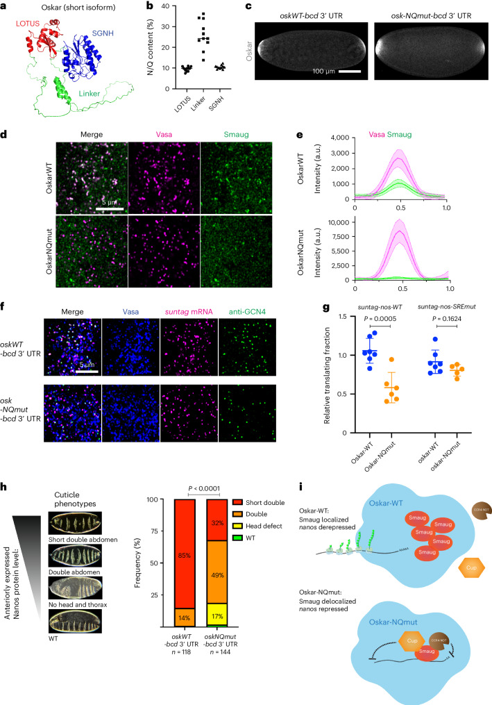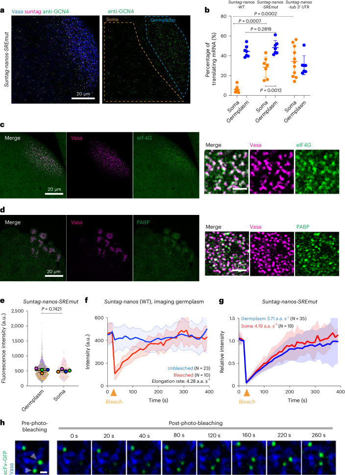 Biomolecular condensates organize biochemical processes at the subcellular level and can provide spatiotemporal regulation within a cell. Among these, ribonucleoprotein (RNP) granules are storage hubs for translationally repressed mRNA. Whether RNP granules can also activate translation and how this could be achieved remains unclear. Here, using single-molecule imaging, we demonstrate that the germ cell-determining RNP granules in Drosophila embryos are sites for active translation of nanos mRNA. Nanos translation occurs preferentially at the germ granule surface with the 3' UTR buried within the granule. Smaug, a cytosolic RNA-binding protein, represses nanos translation, which is relieved when Smaug is sequestered to the germ granule by the scaffold protein Oskar. Together, our findings uncover a molecular process by which RNP granules achieve localized protein synthesis through the compartmentalized loss of translational repression.
