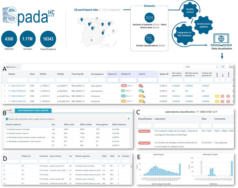 Accurate classification of genetic variants is crucial for clinical decision-making in hereditary cancer. In Spain, genetic diagnostic laboratories have traditionally approached this task independently due to the lack of a dedicated resource. Here we present SpadaHC, a web-based database for sharing variants in hereditary cancer genes in the Spanish population. SpadaHC is implemented using a three-tier architecture consisting of a relational database, a web tool and a bioinformatics pipeline. Contributing laboratories can share variant classifications and variants from individuals in Variant Calling Format (VCF) format. The platform supports open and restricted access, flexible dataset submissions, automatic pseudo-anonymization, VCF quality control, variant normalization and liftover between genome builds. Users can flexibly explore and search data, receive automatic discrepancy notifications and access SpadaHC population frequencies based on many criteria. In February 2024, SpadaHC included 18 laboratory members, storing 1.17 million variants from 4306 patients and 16 343 laboratory classifications. In the first analysis of the shared data, we identified 84 genetic variants with clinically relevant discrepancies in their classifications and addressed them through a three-phase resolution strategy. This work highlights the importance of data sharing to promote consistency in variant classifications among laboratories, so patients and family members can benefit from more accurate clinical management. Database URL: https://spadahc.ciberisciii.es/.