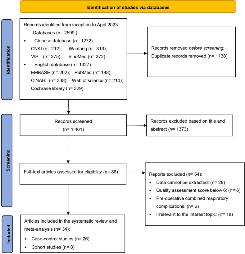 Postoperative pulmonary complications (PPCs) are associated with high mortality rates after lung cancer surgery. Although some studies have discussed the different risk factors for PPCs, the relationship between these factors and their impact on PPCs remains unclear. Hence, this study aimed to systematically summarize the incidence and determine the risk factors for PPCs. We conducted a systematic search of five English and four Chinese databases from their inception to April 1, 2023. A total of 34 articles (8 cohort studies and 26 case-control studies) (n = 31696, 5833 with PPCs) were included in the analysis. The primary outcome was the incidence of PPC. The secondary outcome was the odds ratio (OR) of PPCs based on the identified risk factors calculated by RevMan 5.4. A narrative descriptive summary of the study results was presented when pooling the results or conducting a meta-analysis was not possible. The pooled incidence of PPCs was 18.4 %. This meta-analysis demonstrated that TNM staging (OR 4.29, 95 % CI 2.59-7.13), chronic obstructive pulmonary disease (COPD) (OR 2.47, 95 % CI 1.80-3.40), smoking history (OR 2.37, 95 % CI 1.33-4.21), poor compliance with respiratory rehabilitation (OR 1.64, 95 % CI 1.17-2.30), male sex (OR 1.62, 95 % CI 1.28-2.04), diabetes (OR 1.56, 95 % CI 1.07-2.27), intraoperative bleeding volume (OR 1.44, 95 % CI 1.02-2.04), Eastern Cooperative Oncology Group score (ECOG) > 1 (OR 1.37, 95 % CI 1.04-1.80), history of chemotherapy and/or radiotherapy (OR 1.32, 95 % CI 1.03-1.70), older age (OR 1.18, 95 % CI 1.11-1.24), and duration of surgery (OR 1.07, 95 % CI 1.04-1.10) were significantly associated with a higher risk of PPCs. In contrast, the peak expiratory flow rate (PEF) (OR 0.99, 95 % CI 0.98-0.99) was a protective factor. Clinicians should implement targeted and effective interventions to prevent the occurrence of PPCs.