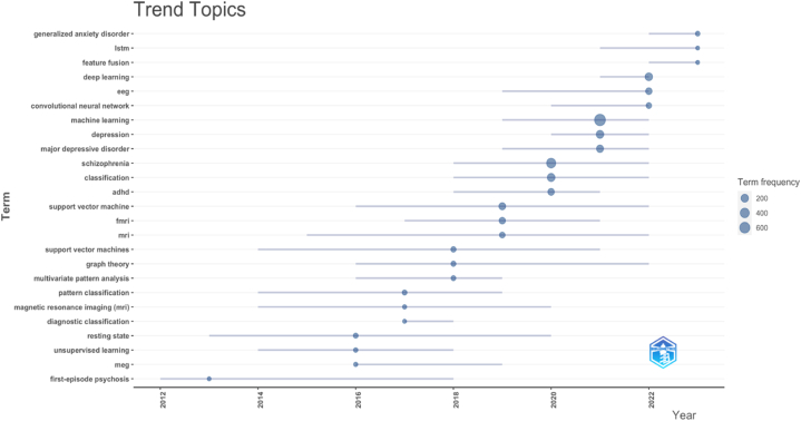 Results: The popularity of ML techniques in diagnosing MDs has been growing, with an annual research growth rate of 17.05 %. The Journal of Affective Disorders published the most documents (n = 97), while Wang Y. (n = 64) has published the most articles. Lotka's law is observed, with a minority of authors contributing the majority of publications. The top affiliating institutes are the West China Hospital of Sichuan University followed by the University of California, with China and the US dominating the top 10 institutes. While China has more publications, papers affiliated with the US receive more citations. Depression and schizophrenia are the primary focuses of ML and deep learning (DL) in mental disease detection. Co-occurrence network analysis reveals that ML is associated with depression, schizophrenia, autism, anxiety, ADHD, obsessive-compulsive disorder, and PTSD. Popular algorithms include support vector machine (SVM) classifier, decision tree classifier, and random forest classifier. Furthermore, DL is linked to neuroimaging techniques such as MRI, fMRI, and EEG, as well as bipolar disorder. Current research trends encompass DL, LSTM, generalized anxiety disorder, feature fusion, and convolutional neural networks.