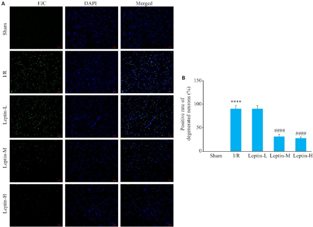方法: 将100只C57BL/6小鼠随机分为5组:假手术(Sham)组、脑缺血/再灌注模型组(I/R组)、瘦素低剂量组(Leptin-L组,0.5 mg/kg)、瘦素中剂量组(Leptin-M组,1 mg/kg)和瘦素高剂量组(Leptin-H组,2 mg/kg),20只/组。采用改良线栓法复制小鼠局灶性脑缺血/再灌注模型,缺血1.5 h再灌注24 h后进行神经功能评分评估神经功能缺损程度,TTC染色测定脑梗死面积,HE染色观察皮层脑组织病理变化,退化神经元染色观察皮层神经元变性损伤程度,免疫组织化学染色测定皮层脑组织胶原酸性纤维蛋白的表达和形态变化,Western blot测定皮层脑组织胶原酸性纤维蛋白蛋白表达。在此基础上,另将45只C57BL/6小鼠随机分为Sham组、I/R组和Leptin组(1 mg/kg),15只/组。谷氨酸检测试剂盒检测皮层脑组织谷氨酸含量,免疫组织化学染色测定皮层谷氨酸-天冬氨酸转运体(GLAST)和谷氨酸转运体1(GLT-1)表达,Western blotting测定GLAST、GLT-1蛋白表达。