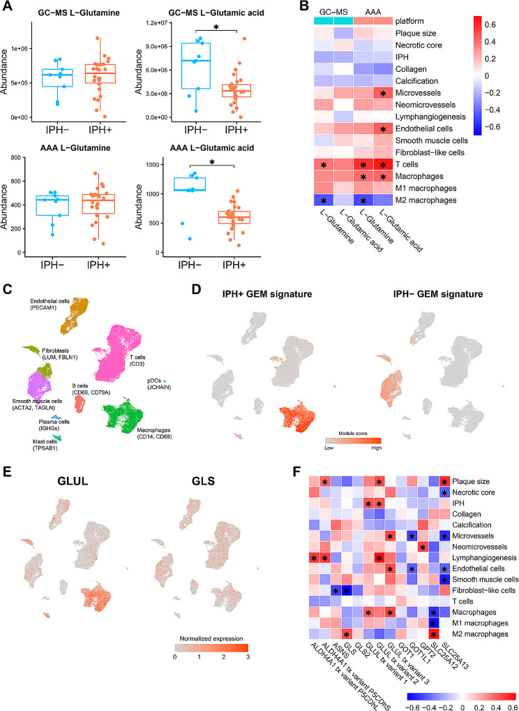 Results: Our study identified significant changes in lipid, cholesterol, and inositol metabolism, along with altered lysosomal lytic activity and increased inflammatory activity, in unstable plaques with intraplaque hemorrhage (IPH+) compared to non-hemorrhaged (IPH-) plaques. Moreover, topological analysis of this network model revealed that the conversion of glutamine to glutamate and their flux between the cytoplasm and mitochondria were notably compromised in hemorrhaged plaques, with a significant reduction in overall glutamate levels in IPH+ plaques. Additionally, reduced glutamate availability was associated with an increased presence of macrophages and a pro-inflammatory phenotype in IPH+ plaques, suggesting an inflammation-prone microenvironment.