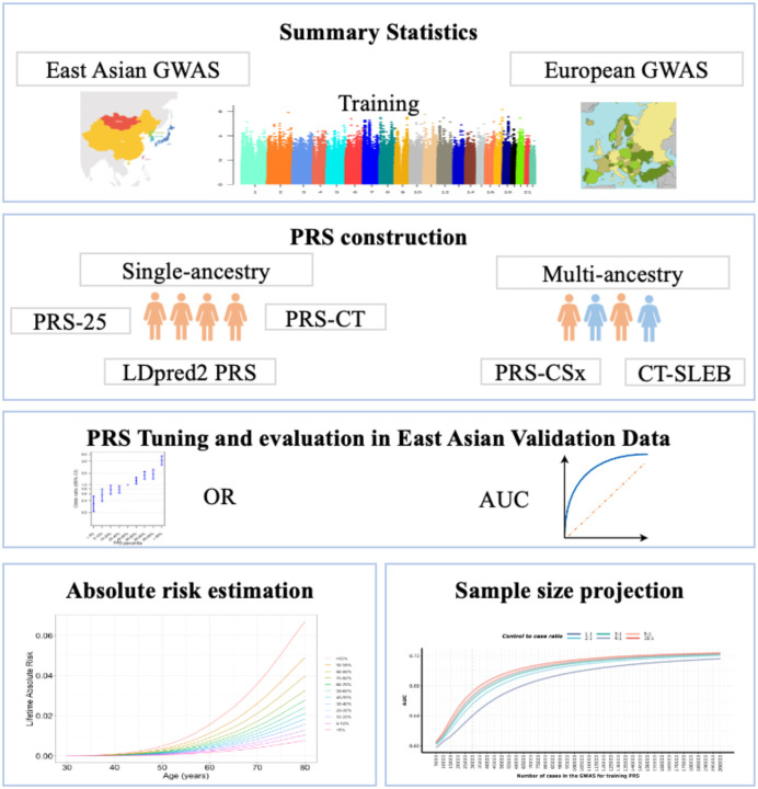 Methods: PRSs were developed using genome-wide association study summary statistics from East Asian (8,002 cases; 20,782 controls) and European (2,058 cases; 5,575 controls) populations. Single-ancestry models included PRS-25, PRS-CT, and LDpred2; multi-ancestry models included LDpred2+PRS-EUR128, PRS-CSx, and CT-SLEB. Performance was evaluated in independent East Asian data from the Female Lung Cancer Consortium (FLCCA) and externally validated in the Nanjing Lung Cancer Cohort (NJLCC). We assessed predictive accuracy via AUC, with 10-year and (age 30-80) absolute risks estimates.
