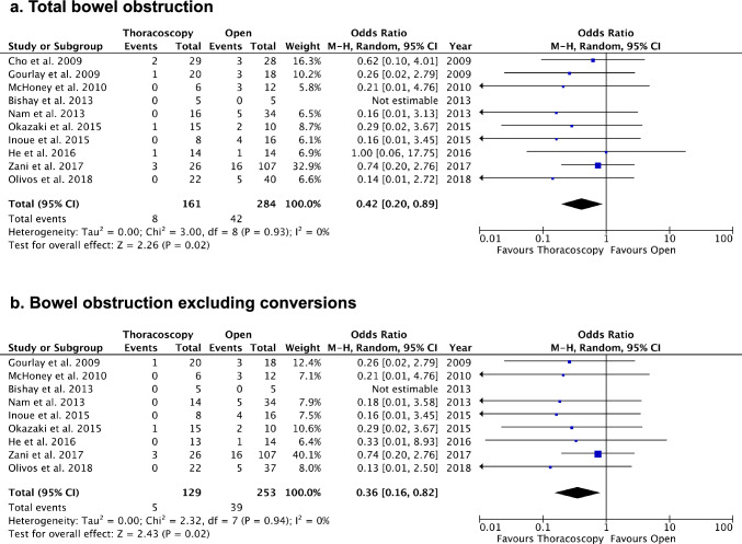 Results: Fourteen studies were selected for quantitative analysis, including a total of 709 patients (TR: 308 cases, OR: 401 cases). The recurrence rate was higher [Odds ratio: 4.03, 95% CI (2.21, 7.36), p < 0.001] and operative times (minutes) were longer [Mean Difference (MD): 43.96, 95% CI (24.70, 63.22), p < 0.001] for TR compared to OR. A significant reduction in the occurrence of postoperative bowel obstruction was observed in TR (5.0%) compared to OR (14.8%) [Odds ratio: 0.42, 95% CI (0.20, 0.89), p = 0.02].