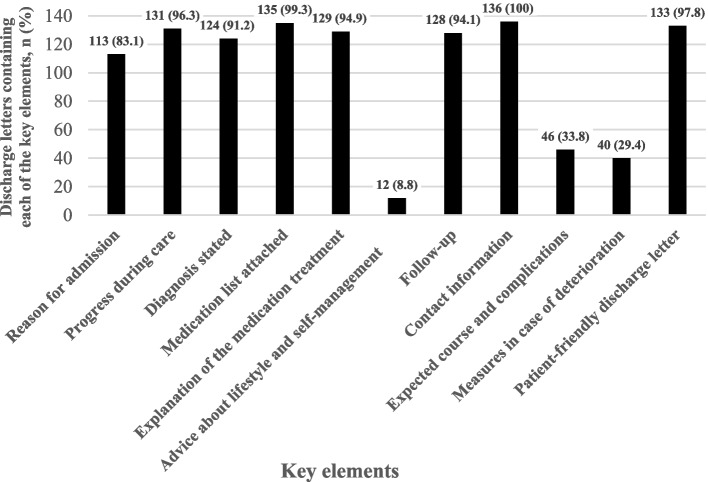 Results: All discharge letters contained at least five of eleven key elements. In less than two per cent of the discharge letters, all eleven key elements were present. Neither SAFE-D score, nor single key elements correlated with 30-day or 90-day readmission rate. SAFE-D score was not associated with time to readmission when adjusted for a range of patient characteristics and self-rated quality of care transitions.