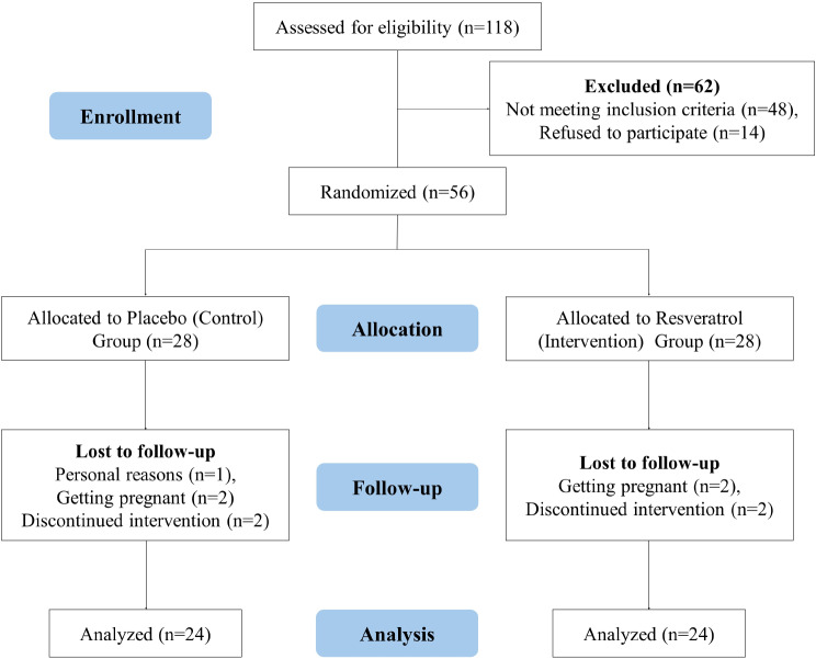 Methods: Fifty-six patients with PCOS were randomly assigned to receive 800 mg/day of resveratrol or placebo for 60 days. The primary outcome was OS in follicular fluid (FF). The secondary outcome involved assessing gene and protein expression related to mitochondrial biogenesis, mitochondrial DNA (mtDNA) copy number, and adenosine triphosphate (ATP) content in granulosa cells (GCs). ART outcomes were evaluated at the end of the trial.