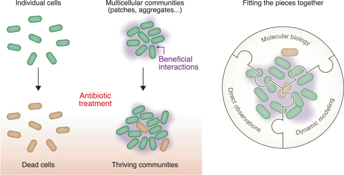 In a variety of infections, bacteria form multicellular communities which contribute to virulence and antibiotic tolerance. The molecular biology of such communities is actively studied, but our understanding of them remains incomplete. In this issue, Şimşek et al have developed and experimentally validated a dynamic model for community formation and revealed general insights into bacterial collective survival during antibiotic exposure.