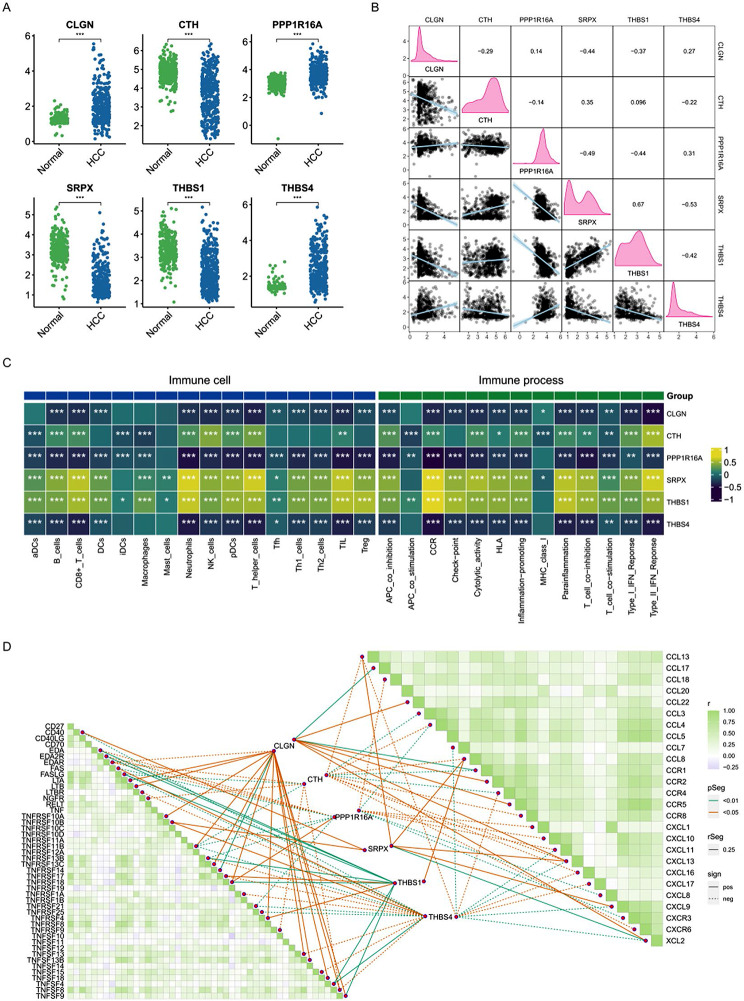 Results: An ANN related to the ERS model was constructed based on SRPX, THBS4, CTH, PPP1R16A, CLGN, and THBS1. The area under the curve (AUC) of the model in the training set was 0.979, and the AUC values in three validation sets were 0.958, 0.936, and 0.970, respectively, indicating high reliability and effectiveness. Spearman correlation analysis suggests that the expression levels of ERSRGs are significantly correlated with immune cell infiltration and immune-related pathways, indicating their potential as important targets for immunotherapy. Mometasone was predicted to be the most promising treatment drug based on its highest binding score. Among the six ERSRGs, PPP1R16A had the highest mutation rate, predominantly copy number mutations, which may be the core gene of the ERSRGs model. Single-cell analysis and cell communication indicated that PPP1R16A is predominantly distributed in liver malignant parenchymal cells and may reshape the tumor microenvironment by enhancing macrophage migration inhibitory factor (MIF)/CD74 + CXCR4 signaling pathways. Functional experiments revealed that after siRNA knockdown, the expression of PPP1R16A was downregulated, which inhibited the proliferation, migration, and invasion capabilities of HCCLM3 and Hep3B cells in vitro.