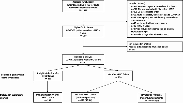 Conclusions: In severely hypoxemic COVID-19 patients, no significant differences were observed on 90-day mortality between patients receiving straight intubation and those receiving NIV after HFNO failure. NIV strategy was associated with a significant reduction in ICU length of stay, despite an increase in mortality in the subgroup of patients finally intubated.