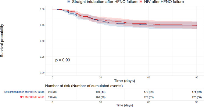 Results: We included 461 patients with HFNO failure in the analysis, 233 patients in the straight intubation group and 228 in the NIV group. The 90-day mortality did not significantly differ between groups, 58/228 (25.4%) int the NIV group compared with 59/233 (25.3%) in the straight intubation group, with an adjusted hazard ratio (HR) after propensity score weighting of 0.82 [95%CI, 0.50-1.35] (p = 0.434). ICU length of stay was significantly shorter in the NIV group compared to the straight intubation group, 10.0 days [IQR, 7.0-19.8] versus 18.0 days [IQR,11.0-31.0] with a propensity score weighted HR of 1.77 [95%CI, 1.29-2.43] (p < 0.001). A subgroup analysis showed a significant increase in mortality rate for intubated patients in the NIV group with 56/122 (45.9%), compared to 59/233 (25.3%) for patients in the straight intubation group (p < 0.001).