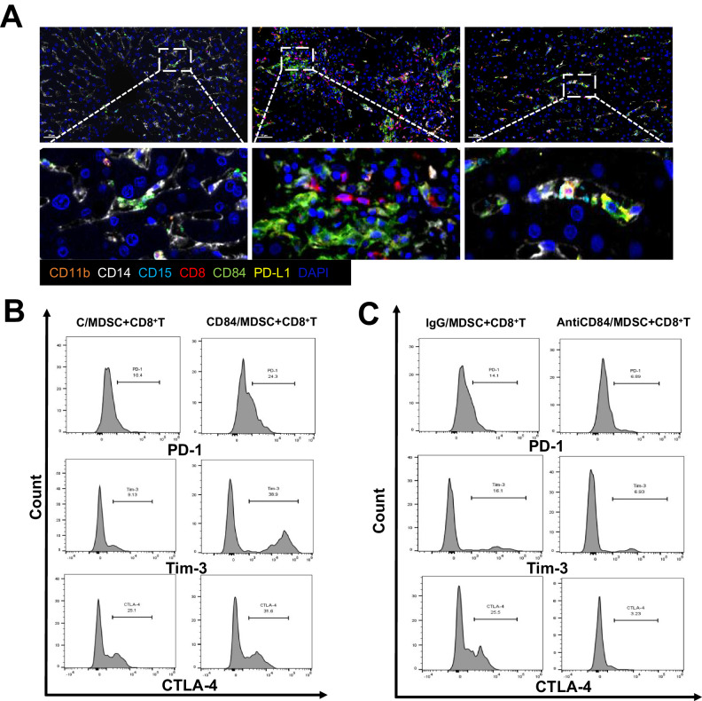 Liver transplantation (LT) rejection remains the most pervasive problem associated with this procedure, while the mechanism involved is still complicated and undefined. One promising solution may involve the use of myeloid-derived suppressor cells (MDSC). However, the immunological mechanisms underlying the effects of MDSC after LT remain unclear. This study is meant to clarify the role MDSCs play after liver transplantation. In this study, we collected liver tissue and peripheral blood mononuclear cells (PBMC) from LT patients showing varying degrees of rejection, as well as liver and spleen tissue samples from mice LT models. These samples were then analyzed using flow cytometry, immunohistochemistry and multiple immunofluorescence. M-MDSCs and CD8 + T-cells extracted from C57/BL6 mice were enriched and cocultured for in vitro experiments. Results, as obtained in both LT patients and LT mice model, revealed that the proportion and frequency of M-MDSC and PD-1 + T-cells increased significantly under conditions associated with a high degree of LT rejection. Within the LT rejection group, our immunofluorescence results showed that a close spatial contiguity was present between PD-1 + T-cells and M-MDSCs in these liver tissue samples and the proportion of CD84/PD-L1 double-positive M-MDSC was greater than that of G-MDSC. There was a positive correlation between the activity of CD84 and immunosuppressive function of M-MDSCs including PD-L1 expression and reactive oxygen species (ROS) production, as demonstrated in our in vitro model. M-MDSCs treated with CD84 protein were able to induce co-cultured CD8 + T-cells to express high levels of exhaustion markers. We found that CD84 regulated M-MDSC function via expression of PD-L1 through activation of the Akt/Stat3 pathway. These results suggest that the capacity for CD84 to regulate M-MDSC induction of CD8 + T-cell exhaustion may play a key role in LT rejection. Such findings provide important, new insights into the mechanisms of tolerance induction in LT.