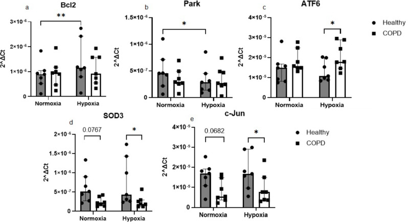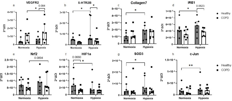 Methods: In this study we aimed to investigate if there are differences in how primary distal lung fibroblasts obtained from COPD patients and healthy subjects respond to hypoxia (1% O2) and pro-fibrotic stimuli with TGF-β1 (10 ng/mL). Genes and proteins associated with oxidative stress, endoplasmic reticulum stress, remodelling and inflammation were analysed with RT-qPCR and ELISA.