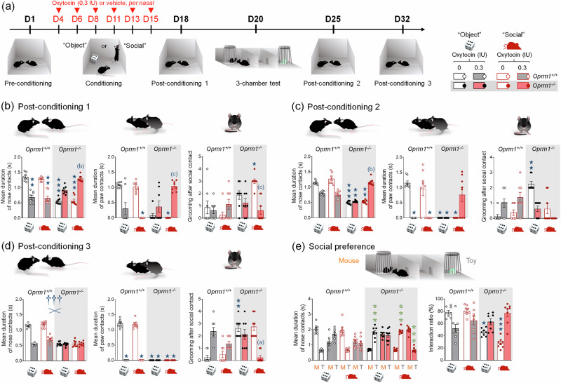 Autism Spectrum Disorders (ASD) are neurodevelopmental disorders whose diagnosis relies on deficient social interaction and communication together with repetitive behaviours. Multiple studies have highlighted the potential of oxytocin (OT) to ameliorate behavioural abnormalities in animal models and subjects with ASD. Clinical trials, however, yielded disappointing results. Our study aimed at assessing the behavioural effects of different regimens of OT administration in the Oprm1 null mouse model of ASD. We assessed the effects of intranasal OT injected once at different doses (0.15, 0.3, and 0.6 IU) and time points (5, 15, and 30 min) following administration, or chronically, on ASD-related behaviours (social interaction and preference, stereotypies, anxiety, nociception) in Oprm1+/+ and Oprm1-/- mice. We then tested whether pairing intranasal OT injection with social experience would influence its outcome on ASD-like symptoms, and measured gene expression in the reward/social circuit. Acute intranasal OT at 0.3 IU improved social behaviour in Oprm1-/- mice 5 min after administration, with limited effects on non-social behaviours. Chronic (8-17 days) OT maintained rescuing effects in Oprm1 null mice but was deleterious in wild-type mice. Finally, improvements in the social behaviour of Oprm1-/- mice were greater and longer lasting when OT was administered in a social context. Under these conditions, the expression of OT and vasopressin receptor genes, as well as marker genes of striatal projection neurons, was suppressed. We detected no sex difference in OT effects. Our results highlight the importance of considering dosage and social context when evaluating the effects of OT treatment in ASD.