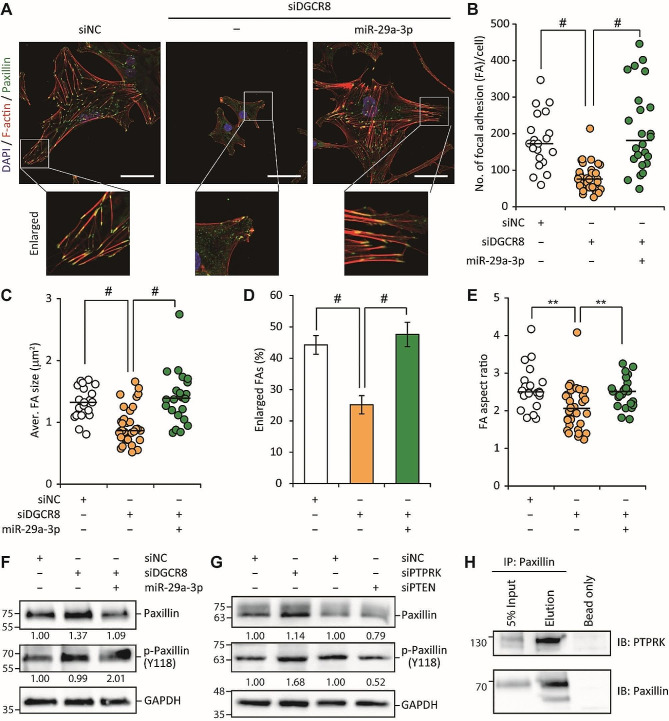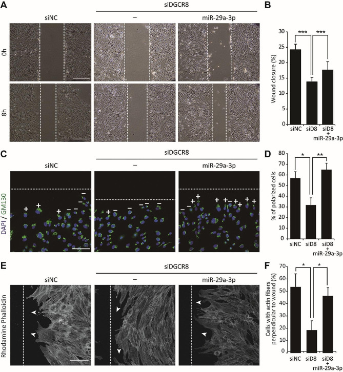 Results: The global depletion of microRNAs (miRNAs) due to DGCR8 gene silencing, a critical component of miRNA biogenesis, significantly impaired hMSC migration. The bioinformatics analysis identified miR-29a-3p as a pivotal upstream regulator. Its overexpression in DGCR8-knockdown hMSCs markedly improved their migration capabilities. Our data demonstrate that miR-29a-3p enhances cell migration by directly inhibiting two key phosphatases: protein tyrosine phosphatase receptor type kappa (PTPRK) and phosphatase and tensin homolog (PTEN). The ectopic expression of miR-29a-3p stabilized the polarization of the Golgi apparatus and actin cytoskeleton during wound healing. It also altered actomyosin contractility and cellular traction forces by changing the distribution and phosphorylation of myosin light chain 2. Additionally, it regulated focal adhesions by modulating the levels of PTPRK and paxillin. In immunocompromised mice, the migration of hMSCs overexpressing miR-29a-3p toward a chemoattractant significantly increased.
