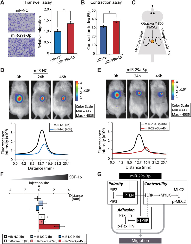 Conclusions: Our findings identify miR-29a-3p as a key upstream regulator that governs hMSC migration. Specifically, it was found to modulate principal signaling pathways, including polarization, actin cytoskeleton, contractility, and adhesion, both in vitro and in vivo, thereby reinforcing migration regulatory circuits.
