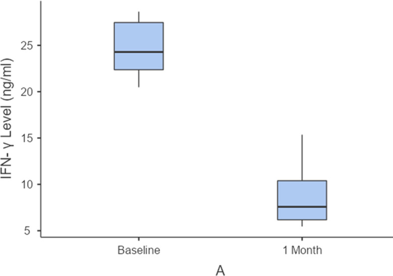 Results: After one month of treatment, a significantly greater number of patients in group A showed complete pain relief and resolution of clinical lesions, as well as a greater number of patients showing a reduction in the clinical severity of lesions than in group B (P = 0.005). Also, there was a statistically significant reduction in average VAS pain scores and clinical scores in group A compared to group B after 1 month of treatment (P = 0.001 and 0.002, respectively). Furthermore, there was a statistically significant greater reduction in salivary and tissue IFN-γ levels in group A than in group B (P ≤ 0.001 and 0.029, respectively) after 1 month of treatment.