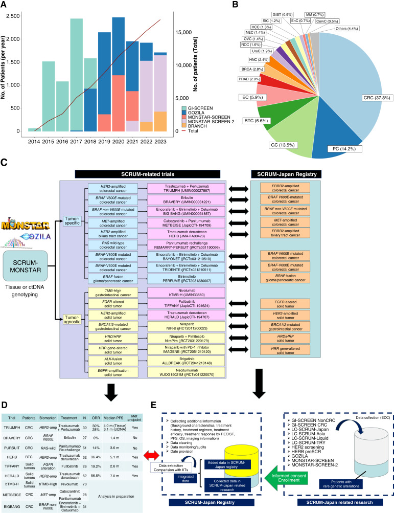 The SCRUM-Japan MONSTAR-SCREEN consortium is a nationwide molecular profiling project employing artificial intelligence-driven multiomics analyses for patients with advanced malignancies, aiming to develop novel therapeutics and diagnostics and deliver effective drugs to patients. Concurrently, studies assessing molecular residual disease-based precision medicine for resectable solid tumors, including CIRCULATE-Japan, are ongoing. The substantial data generated by these platforms are stored within a state-of-the-art supercomputing infrastructure, VAPOR CONE. Since 2015, our project has registered over 24,000 patients as of December 2023. Among 16,144 patients with advanced solid tumors enrolled in MONSTAR-SCREEN projects, 5.0% have participated in matched clinical trials, demonstrating a 29.2% objective response rate and 14.8-month median survival (95% CI, 13.4-16.3) for patients treated in the matched clinical trials. Notably, patients who received matched therapy demonstrated significantly prolonged overall survival compared with those who did not (hazard ratio 0.77; 95% confidence interval, 0.71-0.83). Significance: Our nationwide molecular profiling initiative played pivotal roles in facilitating the enrollment of patients with advanced solid tumors into matched clinical trials and highlighted the substantial survival benefits of patients treated with matched therapy. We aim to facilitate an industry-academia data-sharing infrastructure ecosystem, fostering new drug discovery paradigms and precision medicine.