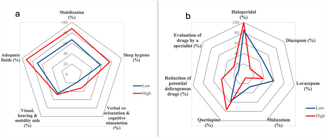 Results: Fifty-eight hospital wards participated in the survey, with 25 (43.1%) classified as HL. The overall reported point prevalence of delirium was found to be approximately 10%. Notably, the reported prevalence was twice as high in the HL group compared to the LL group. Despite minimal differences compared to the other group, the HL group demonstrated greater adherence to appropriate delirium management strategies, encompassing both non-pharmacological and pharmacological strategies. Critical gaps in delirium care emerged, including suboptimal management practices, barriers to implementing evidence-based strategies, and insufficient awareness and training among professionals.