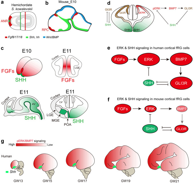 Keywords: BMP7; Cortical evolution; Cortical expansion; Cortical gliogenesis; Cortical neurogenesis; FGF-ERK signaling; Human-specific gene; Interneuron; Radial glia; SHH signaling.
