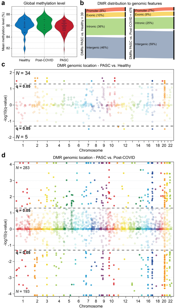 Findings: 103 patients with PASC (22.3% male, 77.7% female), 15 patients with previous COVID-19 infection but no PASC (40.0% male, 60.0% female), and 27 healthy volunteers (48.1% male, 51.9% female) were enrolled. Whole genome methylation sequencing revealed 39 differentially methylated regions (DMRs) specific to PASC, each harbouring an average of 15 consecutive positions, that differentiate patients with PASC from the two control groups. Motif analyses of PASC-regulated DMRs identify binding domains for transcription factors regulating circadian rhythm and others. Some DMRs annotated to protein coding genes were associated with changes of RNA expression. Machine learning support vector algorithm and random forest hierarchical clustering reveal 28 unique differentially methylated positions (DMPs) in the genome discriminating patients with better and worse quality of life.