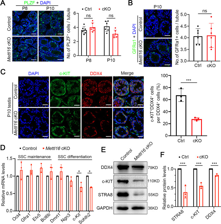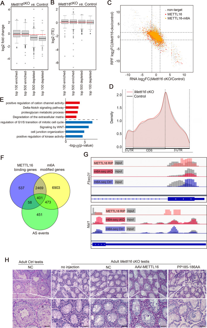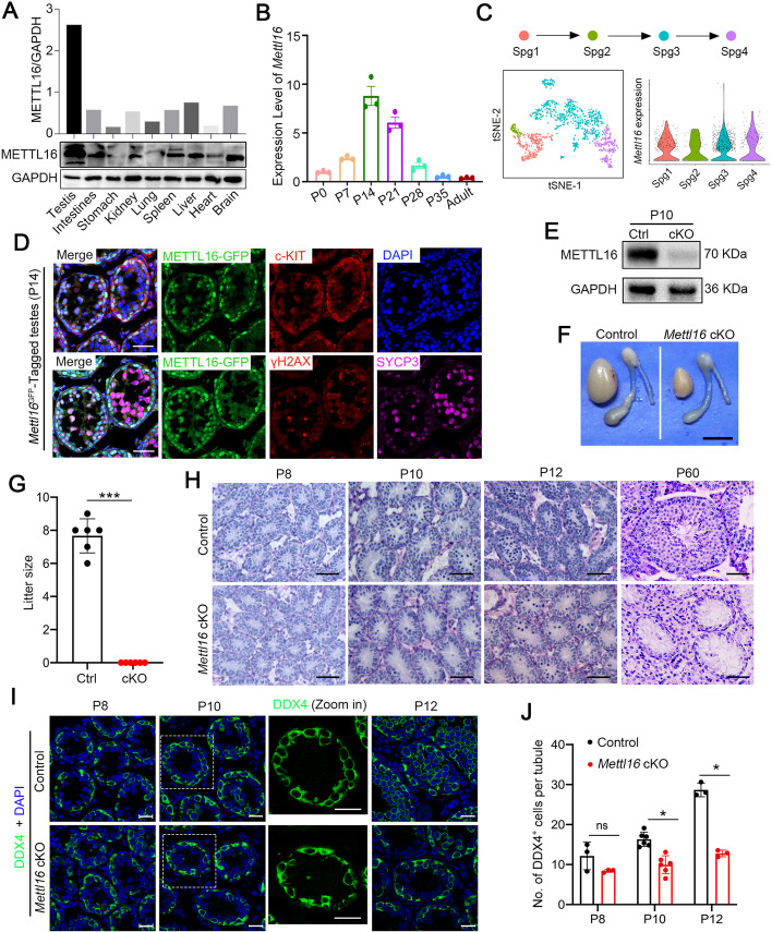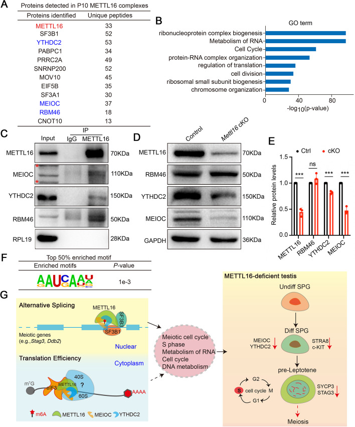 Results: We report that methyltransferase-like protein 16 (METTL16), an N6-methyladenosine (m6A) writer, is required for mitosis-to-meiosis transition during spermatogenesis. Germline conditional knockout of Mettl16 in male mice impairs spermatogonial differentiation and meiosis initiation. Mechanistically, METTL16 interacts with splicing factors to regulate the alternative splicing of meiosis-related genes such as Stag3. Ribosome profiling reveals that the translation efficiency of many meiotic genes is dysregulated in METTL16-deficient testes. m6A-sequencing shows that ablation of METTL16 causes upregulation of the m6A-enriched transcripts and downregulation of the m6A-depleted transcripts, similar to Meioc and/or Ythdc2 mutants. Further in vivo and in vitro experiments demonstrate that the methyltransferase activity site (PP185-186AA) of METTL16 is necessary for spermatogenesis.