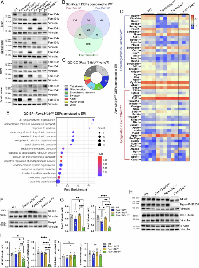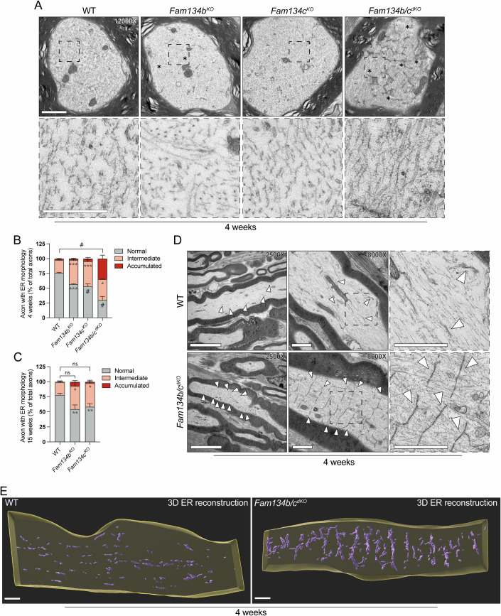 Endoplasmic reticulum (ER) remodeling is vital for cellular organization. ER-phagy, a selective autophagy targeting ER, plays an important role in maintaining ER morphology and function. The FAM134 protein family, including FAM134A, FAM134B, and FAM134C, mediates ER-phagy. While FAM134B mutations are linked to hereditary sensory and autonomic neuropathy in humans, the physiological role of the other FAM134 proteins remains unknown. To address this, we investigate the roles of FAM134 proteins using single and combined knockouts (KOs) in mice. Single KOs in young mice show no major phenotypes; however, combined Fam134b and Fam134c deletion (Fam134b/cdKO), but not the combination including Fam134a deletion, leads to rapid neuromuscular and somatosensory degeneration, resulting in premature death. Fam134b/cdKO mice show rapid loss of motor and sensory axons in the peripheral nervous system. Long axons from Fam134b/cdKO mice exhibit expanded tubular ER with a transverse ladder-like appearance, whereas no obvious abnormalities are present in cortical ER. Our study unveils the critical roles of FAM134C and FAM134B in the formation of tubular ER network in axons of both motor and sensory neurons.