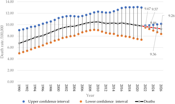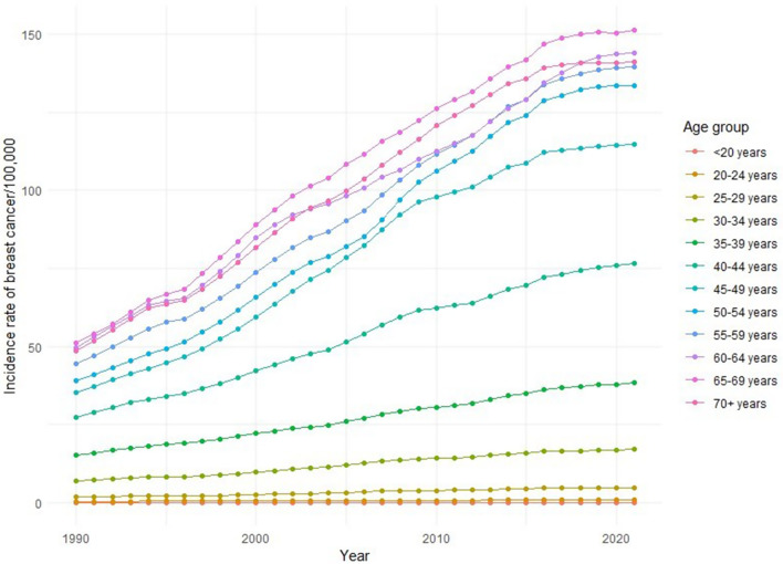 Methods: We retrieved data from the Global Burden of Disease (GBD) about female breast cancer from 1990 to 2021. Time-series analysis used the autoregressive integrated moving average (ARIMA) model to forecast female breast cancer statistics from 2022 to 2026.
