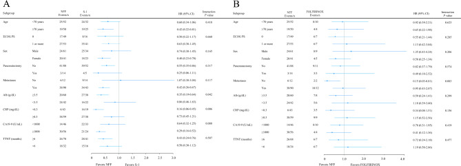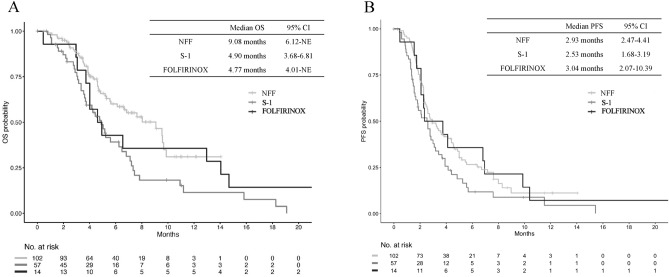 This study aimed to compare second-line treatment outcomes for patients with unresectable pancreatic cancer previously treated with gemcitabine plus nab-paclitaxel (GnP) therapy. We conducted an integrated analysis of two retrospective studies included 318 patients receiving nanoliposomal irinotecan + 5-fluorouracil/folinic acid (NFF) (n = 102), S-1 (n = 57), or FOLFIRINOX (n = 14) as second-line treatment. Median overall survival (OS) in the NFF group was 9.08 months, significantly better than S-1 (4.90 months, P = 0.002). FOLFIRINOX had a median OS of 4.77 months, not statistically different from NFF. Subgroup analyses of OS indicated NFF was generally superior, however, a statistical interaction was observed between the treatment regimen in serum Alb < 3.5 g/dL (P = 0.042) and serum CRP ≥ 0.3 mg/dL (P = 0.006). Median progression-free survival (PFS) was 2.93 months for NFF, significantly better than S-1 (2.53 months, P = 0.024), while FOLFIRINOX had a comparable PFS (3.04 months, P = 0.948). Multivariate analysis identified the serum CRP, serum CA19-9, duration of first-line GnP therapy, and use (yes/no) of S-1 for second-line treatment as independent predictors for OS. This study concludes that second-line NFF therapy demonstrated a more favorable OS compared to S-1 therapy, however, it is still important to consider the patient background characteristics while selecting the most appropriate treatment.