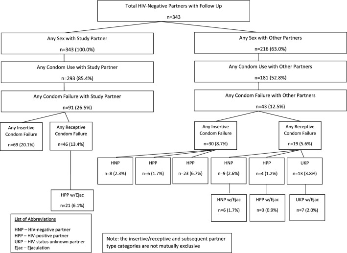 Condoms continue to be used by many gay, bisexual, and other men who have sex with men (GBM) to reduce the risk of HIV transmission. However this is impacted by condom failure events, defined here as condom breakage and slippage. In a prospective, observational cohort study of 343 HIV serodiscordant male couples recruited through high HIV caseload clinics and hospitals between 2012 and 2016 in Australia, Brazil, and Thailand, condom failure rates and associated factors were analysed, including with the study partner versus other sexual partners. There were 717 reported instances of condom failure from an estimated total of 25,831 sex acts with condoms, from over 588.4 participant years of follow up. Of the HIV-negative partners (n = 343) in the study, more than a third (n = 117, 36.7%) reported at least one instance of condom failure with any partner type during study follow-up. Condom failure with their study partner was reported by 91/343 (26.5%) HIV-negative partners, compared with 43/343 (12.5%) who reported condom failure with other partners. In total, there were 86 events where the HIV-negative partner experienced ano-receptive condom failure with ejaculation, representing 12.0% of all failure events. In multivariable analysis, compared to Australia, HIV-negative men in Brazil reported a higher incidence risk rate of condom failure (IRR = 1.64, 95%CI 1.01-2.68, p = 0.046) and HIV-negative men who reported anal sex with other partners reported an increased risk of condom failure compared with men who only had sex with their study partner (IRR = 1.89, 95%CI 1.08-3.33, p = 0.025). Although at least one event of condom failure was reported by a significant proportion of participants, overall condom failure events represented a small proportion of the total condom protected sex acts.
