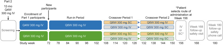 Methods: In part 2, participants received natalizumab (Tysabri®) 300 mg via IV infusion Q6W for 36 weeks and then were randomized to 48 weeks of crossover treatment (24 weeks SC Q6W and 24 weeks IV Q6W, or vice versa). The primary endpoint was the proportion of participants who indicated a preference for natalizumab SC administration on the Patient Preference Questionnaire.