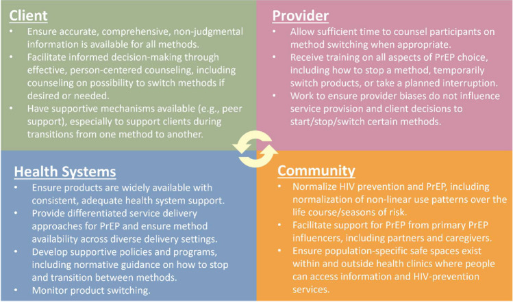 Recent findings: Decades of research in FP has demonstrated that product switching is common and can lead to more satisfaction and increases in contraceptive use. While research on PrEP product switching is nascent, findings suggest switching is common, and that providing more than one PrEP option can increase coverage. Key evidence gaps include understanding product switching in the context of full versus constrained choice, switching in the context of temporary need, and developing interventions that promote product switching for those who could benefit. Providing choice and allowing people to start, stop, and switch products according to their needs and desires is a core component of a rights-based approach to HIV prevention. More research is needed to better understand what drives use patterns, including switching, and how to leverage choice to improve coverage. Standard definitions -some of which have been proposed in this review-are needed to inform comparable measurement. Finally, there is a need to holistically frame PrEP use to acknowledge changes in need over the life course, thus making method switching a standard part of HIV prevention.