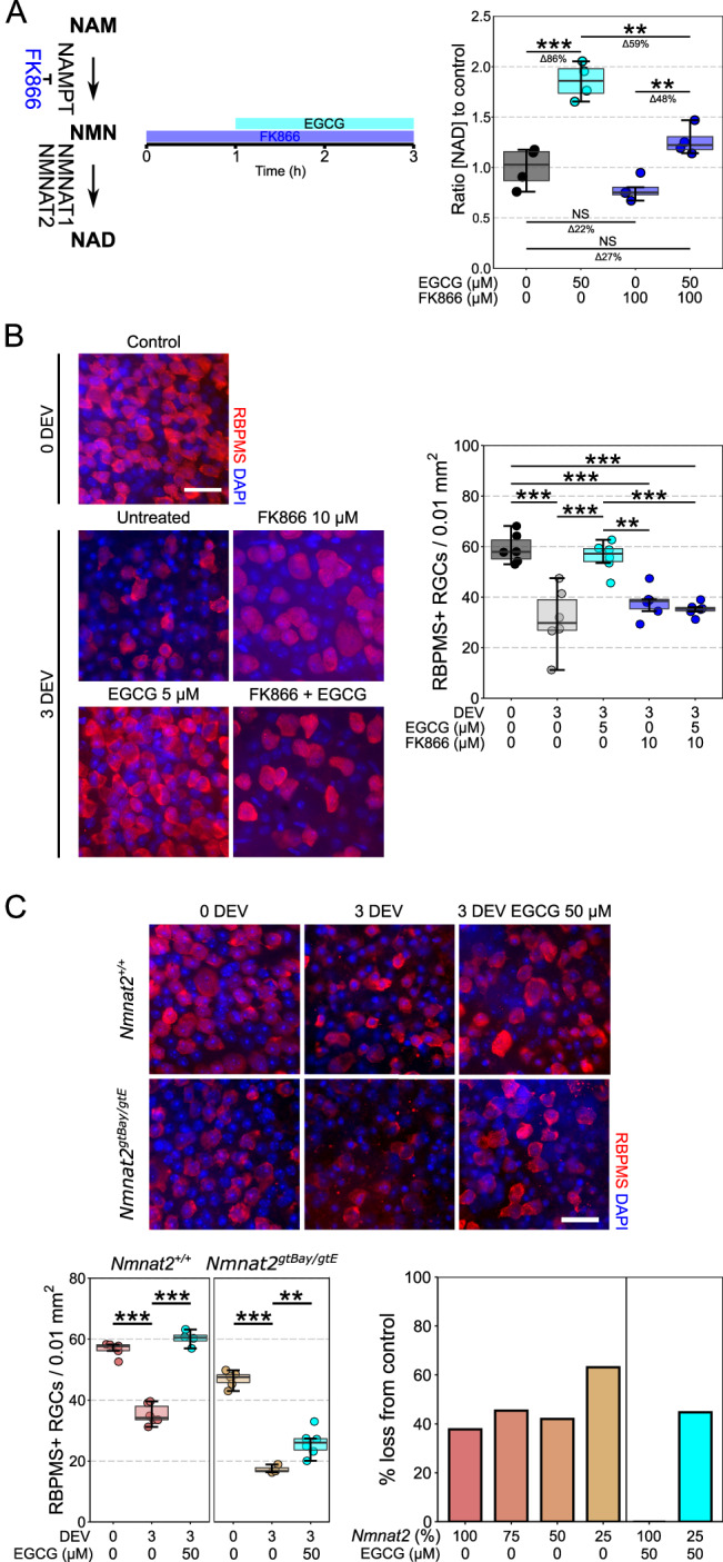 Maintenance of NAD pools is critical for neuronal survival. The capacity to maintain NAD pools declines in neurodegenerative disease. We identify that low NMNAT2, the critical neuronal NAD producing enzyme, drives retinal susceptibility to neurodegenerative insults. As proof of concept, gene therapy over-expressing full length human NMNAT2 is neuroprotective. To pharmacologically target NMNAT2, we identify that epigallocatechin gallate (EGCG) can drive NAD production in neurons through an NMNAT2 and NMN dependent mechanism. We confirm this by pharmacological and genetic inhibition of the NAD-salvage pathway. EGCG is neuroprotective in rodent (mixed sex) and human models of retinal neurodegeneration. As EGCG has poor drug-like qualities, we use it as a tool compound to generate novel small molecules which drive neuronal NAD production and provide neuroprotection. This class of NMNAT2 targeted small molecules could have an important therapeutic impact for neurodegenerative disease following further drug development.