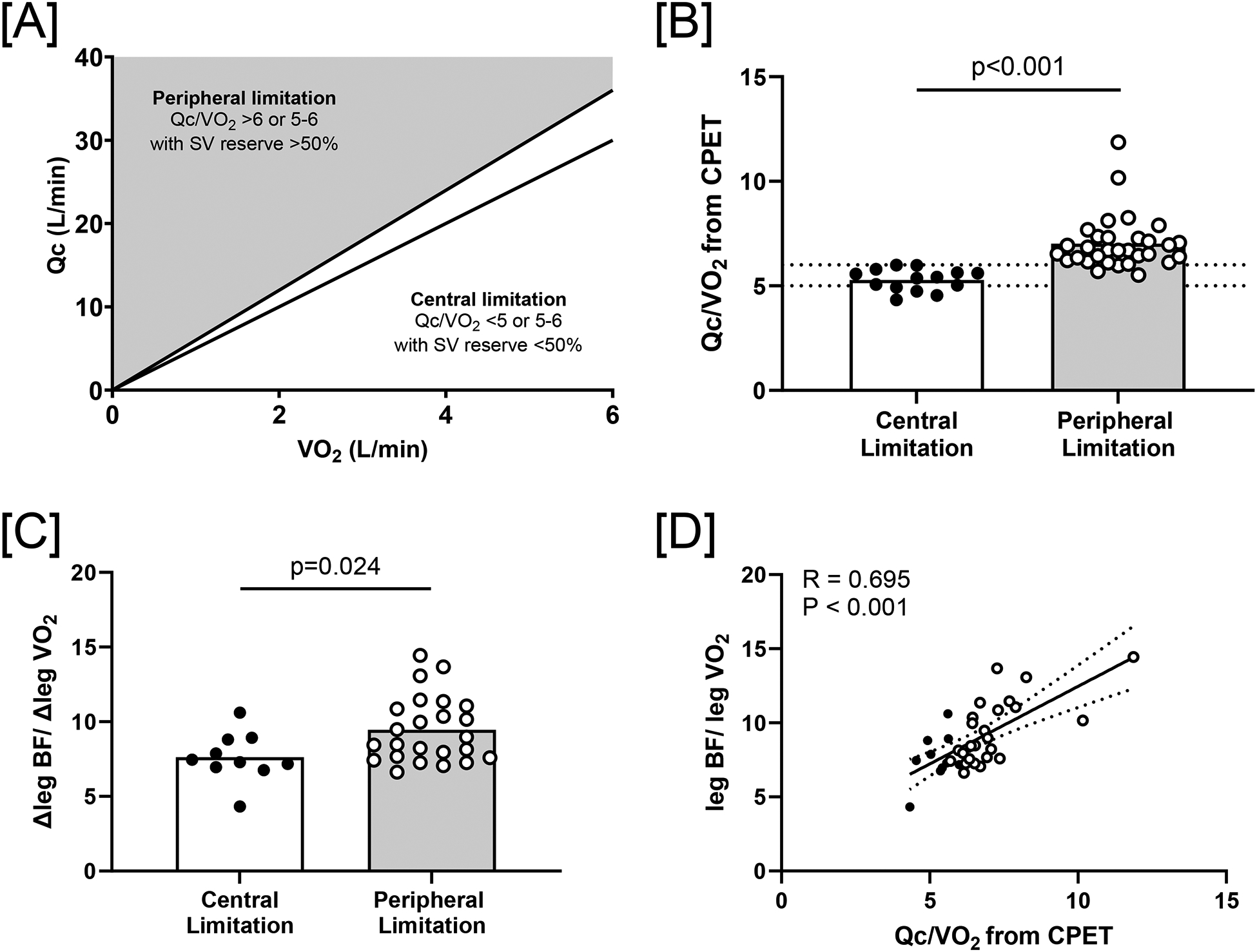 Methods: Forty-five patients with heart failure with preserved ejection fraction (70±7 years, 27 females) completed seated upright cardiopulmonary exercise testing and were defined as having a (1) peripheral limitation to exercise if cardiac output/oxygen consumption (VO2) was elevated (≥6) or 5 to 6 with a stroke volume reserve >50% (n=31) or (2) a central limitation to exercise if cardiac output/VO2 slope was ≤5 or 5 to 6 with stroke volume reserve <50% (n=14). Single leg knee extension exercise was used to quantify peak leg blood flow (Doppler ultrasound), arterial-to-venous oxygen content difference (femoral venous catheter), leg VO2, and muscle oxygen diffusive conductance. In a subset of participants (n=36), phosphocreatine recovery time was measured by magnetic resonance spectroscopy to determine skeletal muscle oxidative capacity.