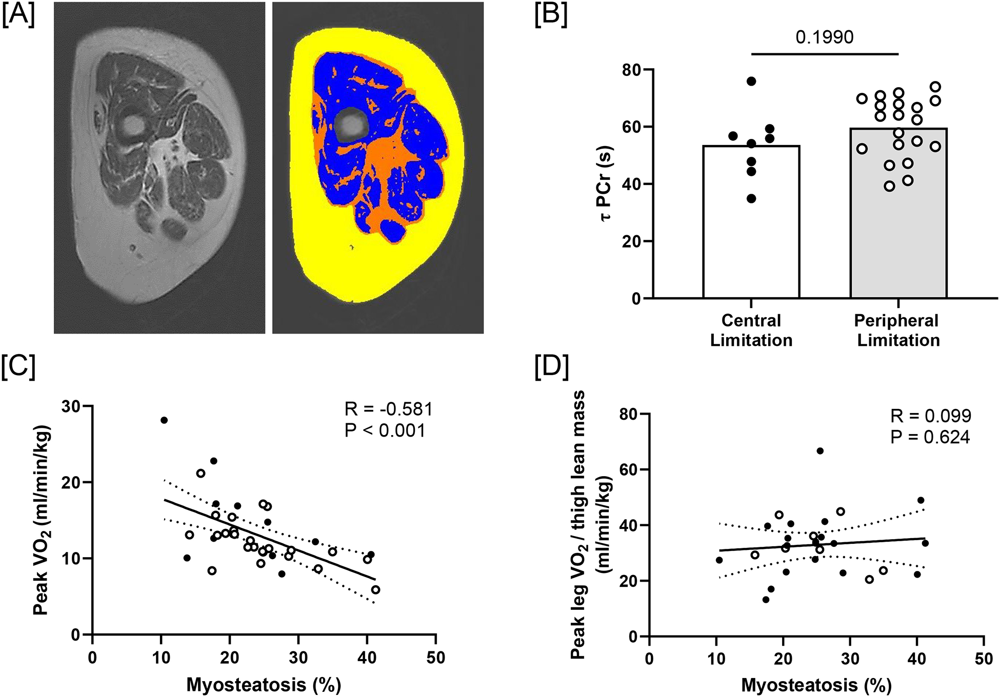 Results: Peak VO2 during cardiopulmonary exercise testing was not different between groups (central: 13.9±5.7 versus peripheral: 12.0±3.1 mL/min per kg; P=0.135); however, the peripheral group had a lower peak arterial-to-venous oxygen content difference (central: 13.5±2.0 versus peripheral: 11.1±1.6 mLO2/dL blood; P<0.001). During single leg knee extension, there was no difference in peak leg VO2 (P=0.306), but the peripherally limited group had greater blood flow/VO2 ratio (P=0.024), lower arterial-to-venous oxygen content difference (central: 12.3±2.5 versus peripheral: 10.3±2.2 mLO2/dL blood; P=0.013), and lower muscle oxygen diffusive conductance (P=0.021). A difference in magnetic resonance spectroscopy-derived phosphocreatine recovery time was not detected (P=0.199).