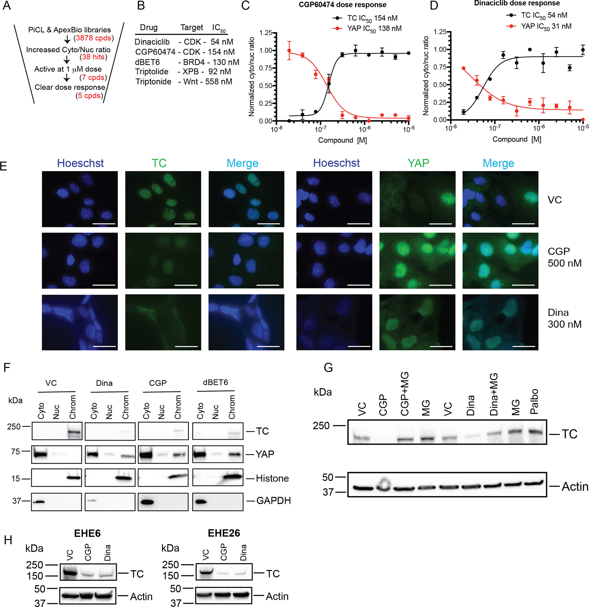 Experimental design: TC is a transcriptional coregulator; we hypothesized that compounds that reduce TC nuclear levels, either through translocation of TC to the cytoplasm, or through degradation, would render TC less oncogenic. TC localization was monitored using immunofluorescence in an EHE tumor cell line. Two target-selective libraries were used to identify small molecules that reduce TC localization in the nucleus. The ability of the shortlisted hits to affect cell viability, apoptosis, and tumorigenesis was also evaluated.