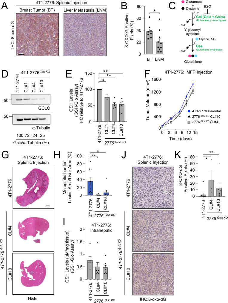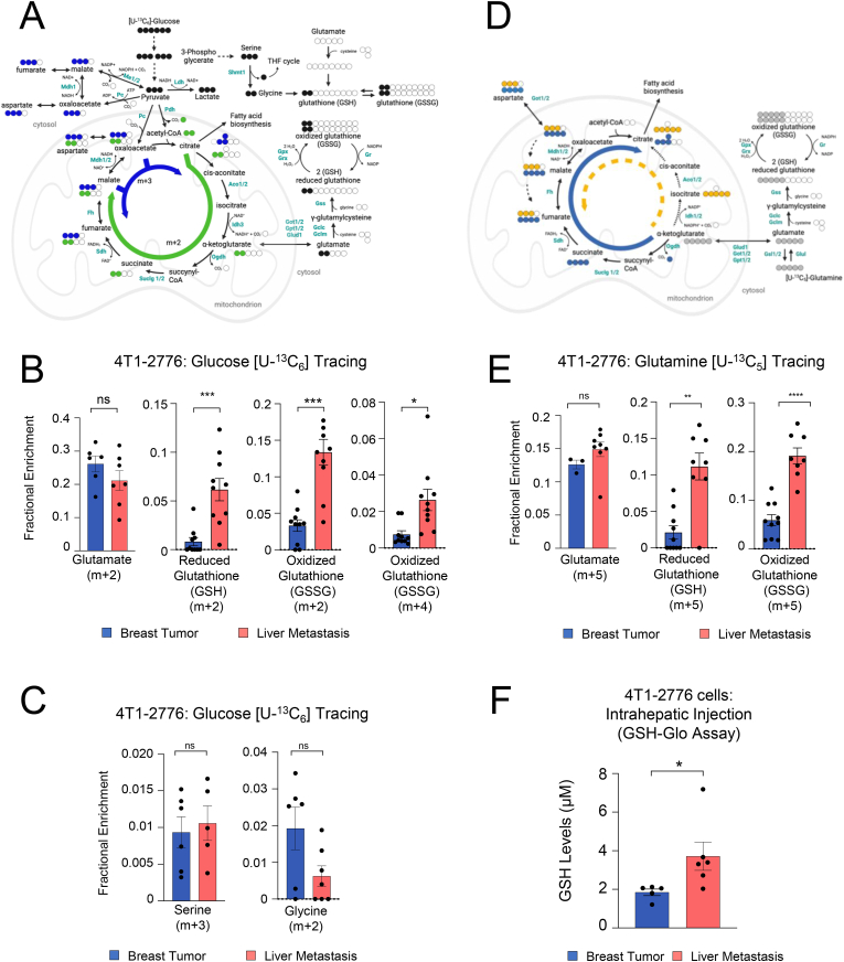 Metabolic rewiring is essential for tumor growth and progression to metastatic disease, yet little is known regarding how cancer cells modify their acquired metabolic programs in response to different metastatic microenvironments. We have previously shown that liver-metastatic breast cancer cells adopt an intrinsic metabolic program characterized by increased HIF-1α activity and dependence on glycolysis. Here, we confirm by in vivo stable isotope tracing analysis (SITA) that liver-metastatic breast cancer cells retain a glycolytic profile when grown as mammary tumors or liver metastases. However, hepatic metastases exhibit unique metabolic adaptations including elevated expression of genes involved in glutathione (GSH) biosynthesis and reactive oxygen species (ROS) detoxification when compared to mammary tumors. Accordingly, breast-cancer-liver-metastases exhibited enhanced de novo GSH synthesis. Confirming their increased capacity to mitigate ROS-mediated damage, liver metastases display reduced levels of 8-Oxo-2'-deoxyguanosine. Depletion of the catalytic subunit of the rate-limiting enzyme in glutathione biosynthesis, glutamate-cysteine ligase (GCLC), strongly reduced the capacity of breast cancer cells to form liver metastases, supporting the importance of these distinct metabolic adaptations. Loss of GCLC also affected the early steps of the metastatic cascade, leading to decreased numbers of circulating tumor cells (CTCs) and impaired metastasis to the liver and the lungs. Altogether, our results indicate that GSH metabolism could be targeted to prevent the dissemination of breast cancer cells.