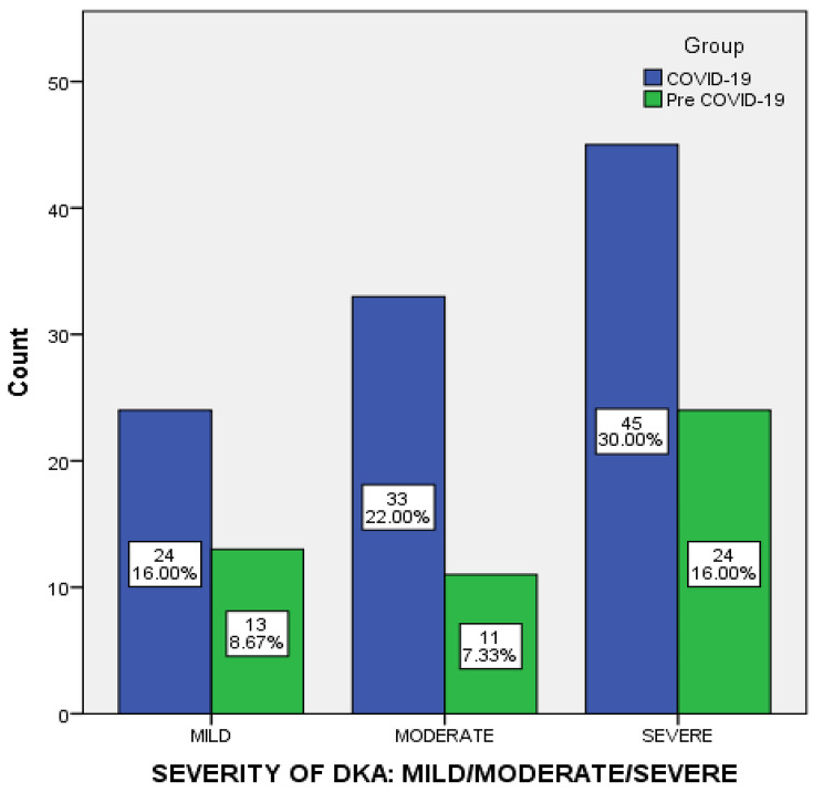 Results: 150 patients admitted with DKA were included (n = 48 pre- COVID-19, n = 102 during COVID-19 (n = 23 COVID-19 positive, n = 79 COVID-19 negative)). Median age was 47 years (IQR 33.0, 59.0), median HbA1C was 12.4% [IQR 10.8, 14.6]), and most patients had severe DKA (46%). Most common DKA precipitants were infections (40.7%), newly diagnosed diabetes (33.3%) and missed medication (25.3%). There was a significant difference in pulmonary infections as a DKA precipitant, between the pre- COVID and during COVID-19 pandemic (21.6% during COVID-19 versus 6.3% pre- COVID-19; p = 0.012). Median total insulin dose used was 110.0 units [IQR 76.0, 173.0], and a 100% of patients received basal insulin. Median length of hospital stay was 4.0 days [IQR 3.0, 6.0] and time to DKA resolution was 30.0 h [IQR 24.0, 48.0]. There were 2 deaths (1.3%), none directly attributable to DKA. Severity of DKA significantly differed between pre- COVID-19, COVID-19 positive and COVID-19 negative DKA (52.2% of COVID-19 positive had moderate DKA compared to 26.6% of COVID-19 negative and 22.9% of Pre-COVID-19 (p = 0.006)).
