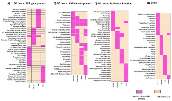 Results: Twenty-six observational studies with a total of 2,486 participants were included. A total of 644 differentially expressed proteins (180 upregulated and 464 downregulated) were identified from 9 studies. Proteins in peripheral blood exhibited a sensitivity and specificity of 38-100% and 59-99%, respectively, for detecting endometriosis, while proteins in urine had a sensitivity of 58-91% and specificity of 76-93%. Alpha-1-antitrypsin, albumin, and vitamin D binding proteins were significantly DEPs in both serum and urine. Complement C3 is commonly expressed in serum, menstrual blood, and cervical mucus. Additionally, S100-A8 is commonly expressed in both menstrual blood and cervical mucus. Haptoglobin is commonly detected in both serum and plasma, whereas cathepsin G is found in urine, serum, and plasma. GO and KEGG enrichment analyses revealed that proteoglycans in cancer pathways, which regulate cell-to-cell interactions, modulate the extracellular matrix, and promote the proliferation and invasion of endometrial cells, are commonly enriched in serum and urine.