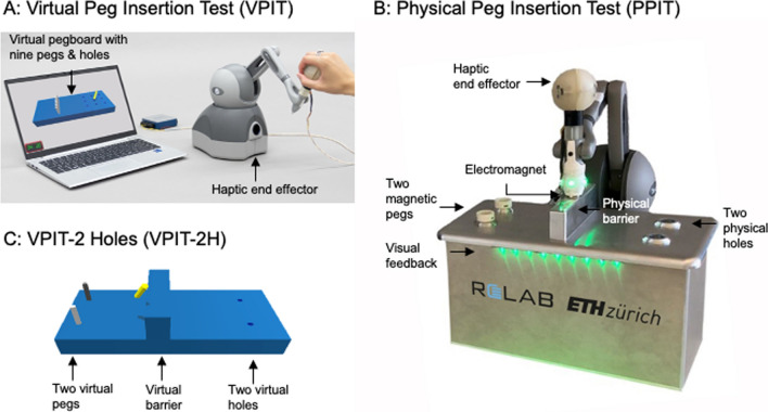 Methods: We aim to investigate the influence of VR and task complexity on the clinimetric properties of digital health metrics describing upper limb function. We relied on the Virtual Peg Insertion Test (VPIT), a haptic VR-based assessment with a virtual manipulation task. To evaluate the influence of VR and task complexity, we designed two novel tasks derived from the VPIT, the VPIT-2H (VR environment with reduced task complexity) and the PPIT (physical task with reduced task complexity). These were administered in an observational longitudinal study with 27 able-bodied participants and 31 participants with multiple sclerosis (pwMS, VPIT and PPIT only) and the value of kinematic and kinetic metrics, their clinimetric properties, and the usability of the assessment tasks were compared.
