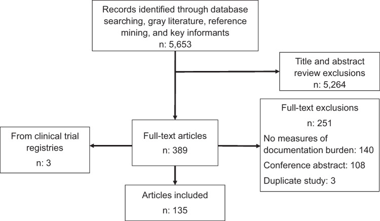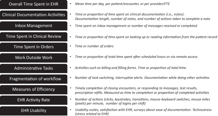 Results: We identified 135 articles about measuring documentation burden. We classified measures into 11 categories: overall time spent in EHR, activities related to clinical documentation, inbox management, time spent in clinical review, time spent in orders, work outside work/after hours, administrative tasks (billing and insurance related), fragmentation of workflow, measures of efficiency, EHR activity rate, and usability. The most common source of data for most measures was EHR usage logs. Direct tracking such as through time-motion analysis was fairly uncommon. Measures were developed and applied across various settings and populations, with physicians and nurses in the USA being the most frequently represented healthcare professionals. Evidence of validity of these measures was limited and incomplete. Data on the appropriateness of measures in terms of scalability, feasibility, or equity across various contexts were limited. The physician perspective was the most robustly captured and prominently focused on increased stress and burnout.
