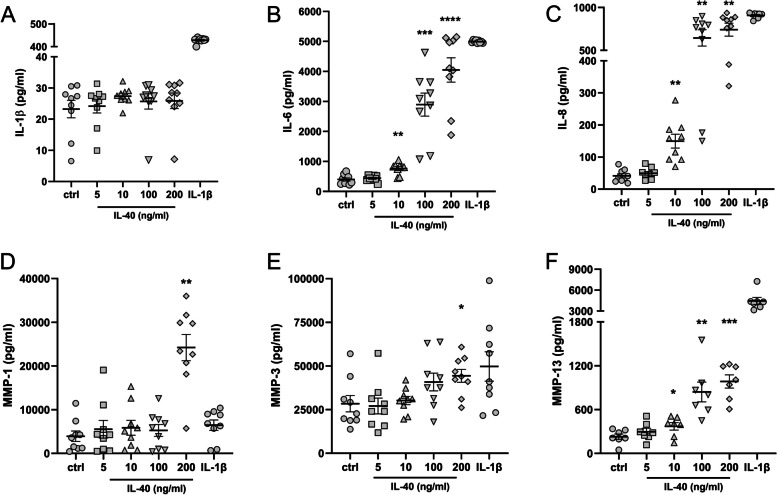 Results: IL-40 was found in chondrocytes of the superficial zone of the OA cartilage, both in loaded and unloaded explants. Additionally, only biopsies from loaded explants showed significant IL-40 positivity in transitional zone chondrocytes. Levels of IL-40 were significantly elevated in the synovial fluid from OA patients compared to controls (p<0.0009) and correlated with synovial fluid leukocyte counts in OA (r=0.444, p=0.014). Chondrocytes exposed to IL-40 dose dependently increased in the secretion of pro-inflammatory cytokines IL-6 (p<0.0001) and IL-8 (p=0.004). Moreover, a dose dependent up-regulation of matrix degrading metalloproteinases MMP-1 (p=0.004), MMP-3 (p=0.031) and MMP-13 (p=0.0002) upon IL-40 treatment was observed in contrast to untreated chondrocytes.