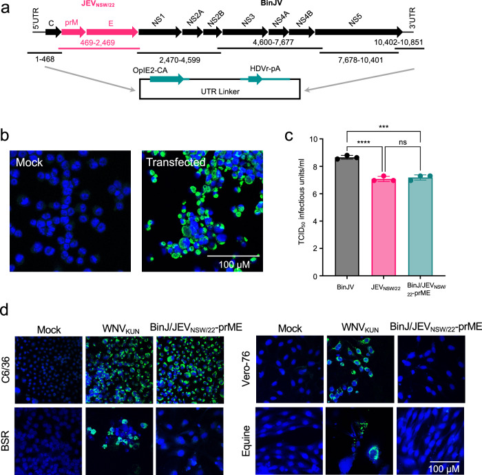 In 2022, a genotype IV (GIV) strain of Japanese encephalitis virus (JEV) caused an unprecedented and widespread outbreak of disease in pigs and humans in Australia. As no veterinary vaccines against JEV are approved in Australia and all current approved human and veterinary vaccines are derived from genotype (G) III JEV strains, we used the recently described insect-specific Binjari virus (BinJV) chimeric flavivirus vaccine technology to produce a JEV GIV vaccine candidate. Herein we describe the production of a chimeric virus displaying the structural prM and E proteins of a JEV GIV isolate obtained from a stillborn piglet (JEVNSW/22) in the genomic backbone of BinJV (BinJ/JEVNSW/22-prME). BinJ/JEVNSW/22-prME was shown to be antigenically indistinguishable from the JEVNSW/22 parental virus by KD analysis and a panel of JEV-reactive monoclonal antibodies in ELISA. BinJ/JEVNSW/22-prME replicated efficiently in C6/36 cells, reaching titres of >107 infectious units/mL - an important attribute for vaccine manufacture. As expected, BinJ/JEVNSW/22-prME failed to replicate in a variety of vertebrate cells lines. When used to immunise mice, the vaccine induced a potent virus neutralising response against JEVNSW/22 and to GII and GIII JEV strains. The BinJ/JEVNSW/22-prME vaccine provided complete protection against lethal challenge with JEVNSW/22, whilst also providing partial protection against viraemia and disease for the related Murray Valley encephalitis virus. Our results demonstrate that BinJ/JEVNSW/22-prME is a promising vaccine candidate against JEV.