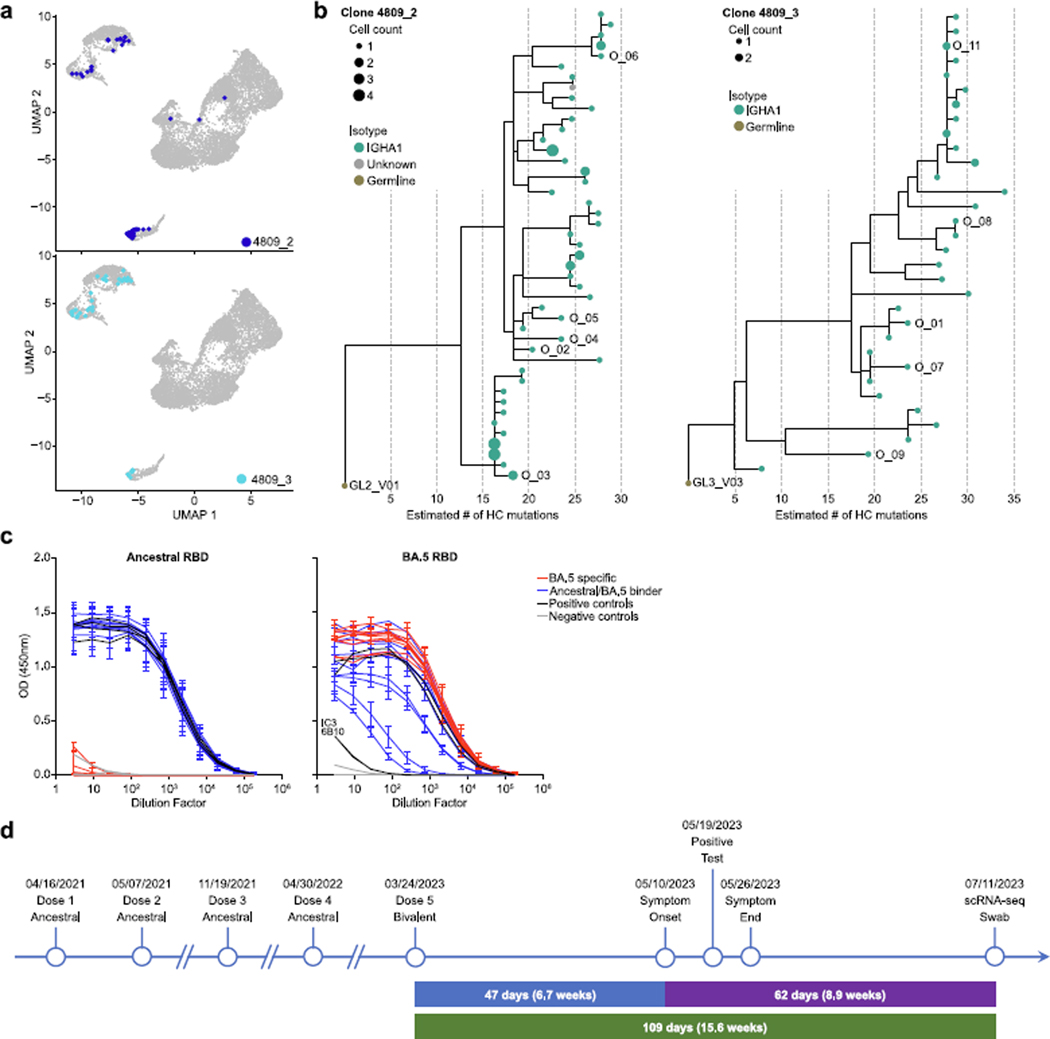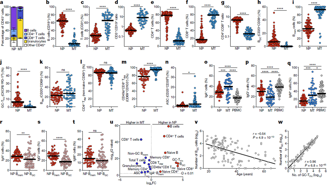 The upper airway is an important site of infection, but immune memory in the human upper airway is poorly understood, with implications for COVID-19 and many other human diseases1-4. Here we demonstrate that nasal and nasopharyngeal swabs can be used to obtain insights into these challenging problems, and define distinct immune cell populations, including antigen-specific memory B cells and T cells, in two adjacent anatomical sites in the upper airway. Upper airway immune cell populations seemed stable over time in healthy adults undergoing monthly swabs for more than 1 year, and prominent tissue resident memory T (TRM) cell and B (BRM) cell populations were defined. Unexpectedly, germinal centre cells were identified consistently in many nasopharyngeal swabs. In subjects with SARS-CoV-2 breakthrough infections, local virus-specific BRM cells, plasma cells and germinal centre B cells were identified, with evidence of local priming and an enrichment of IgA+ memory B cells in upper airway compartments compared with blood. Local plasma cell populations were identified with transcriptional profiles of longevity. Local virus-specific memory CD4+ TRM cells and CD8+ TRM cells were identified, with diverse additional virus-specific T cells. Age-dependent upper airway immunological shifts were observed. These findings provide new understanding of immune memory at a principal mucosal barrier tissue in humans.