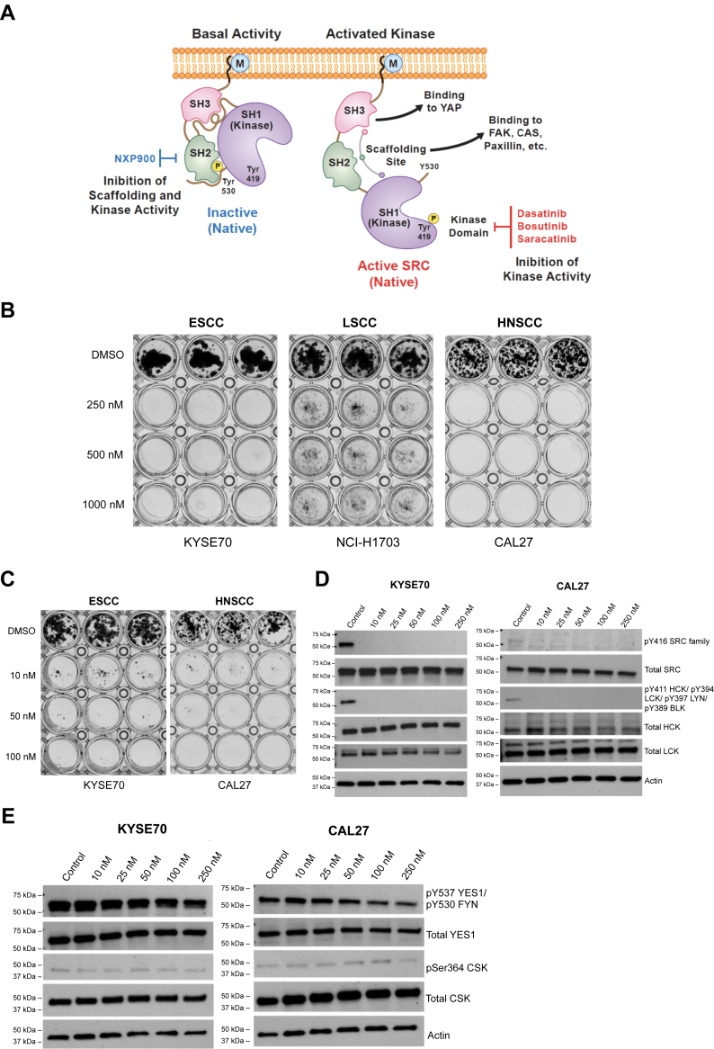 NXP900 is a selective and potent SRC family kinase (SFK) inhibitor, currently being dosed in a phase 1 clinical trial, that locks SRC in the "closed" conformation, thereby inhibiting both kinase-dependent catalytic activity and kinase-independent functions. In contrast, several multi-targeted kinase inhibitors that inhibit SRC, including dasatinib and bosutinib, bind their target in the active "open" conformation, allowing SRC and other SFKs to act as a scaffold to promote tumorigenesis through non-catalytic functions. NXP900 exhibits a unique target selectivity profile with sub-nanomolar activity against SFK members over other kinases. This results in highly potent and specific SFK pathway inhibition. Here, we demonstrate that esophageal squamous cell carcinomas and head and neck squamous cell carcinomas are exquisitely sensitive to NXP900 treatment in cell culture and in vivo, and we identify a patient population that could benefit from treatment with NXP900.