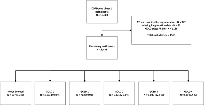 Results: The tool yielded incomplete segmentation in 9.2% (2.4% major defect, 6.8% minor defect) of 250 randomly selected cases. In 8431 COPDGene subjects (4240 healthy; 4191 COPD), the diaphragm index was increasingly lower with higher GOLD stages (never-smoked 1.83 ± 0.16; GOLD-0 1.79 ± 0.18; GOLD-1 1.71 ± 0.15; GOLD-2: 1.67 ± 0.16; GOLD-3 1.58 ± 0.14; GOLD-4 1.54 ± 0.11) (p < 0.001). Associations were found between the diaphragm index and both FEV1% predicted (r = 0.44, p < 0.001) and emphysema score (r = -0.36, p < 0.001).