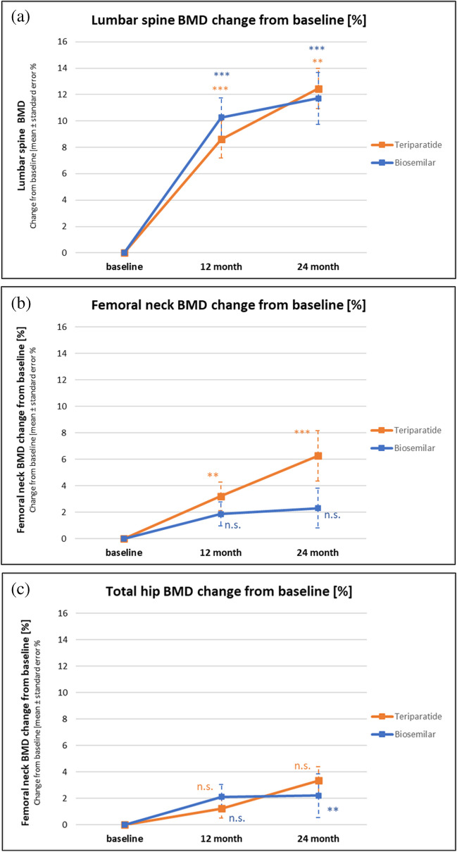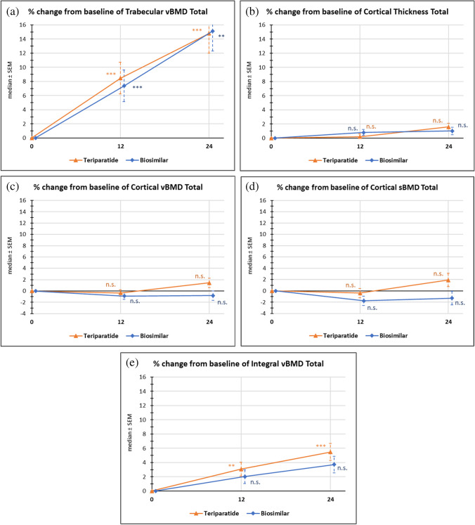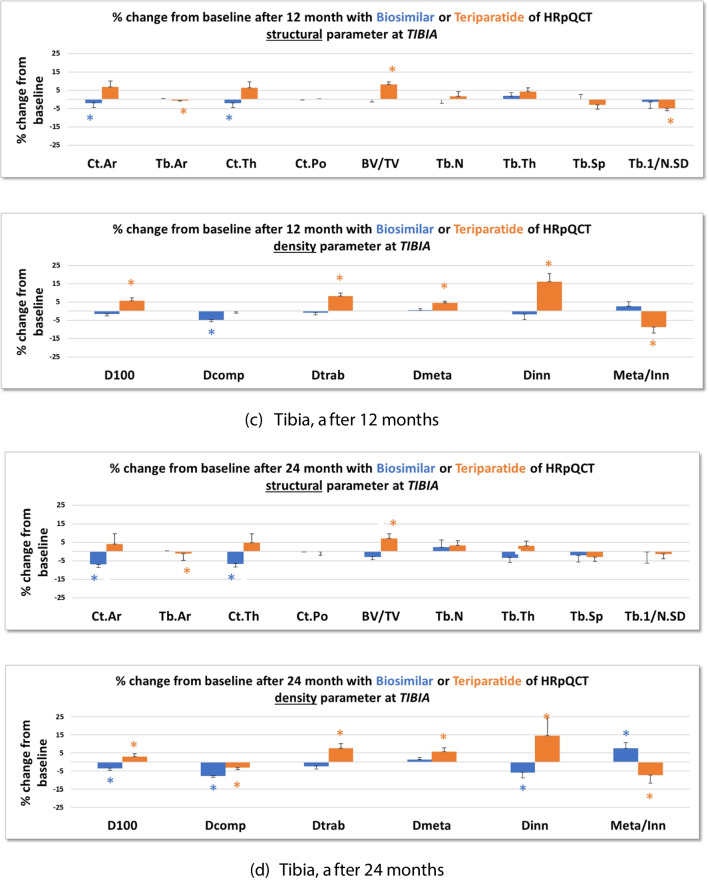 Methods: A retrospective analysis of 25 postmenopausal female patients treated for osteoporosis with RGB-10 for 24 months and a matched cohort of 25 patients treated with reference teriparatide. The following outcomes were assessed at baseline, 12 and 24 months: bone mineral density (BMD) at the lumbar spine, femoral neck and total hip using dual-energy x-ray absorptiometry (DXA) and integral, trabecular and cortical volumetric and surface BMD using 3D-SHAPER® imaging, trabecular bone score (TBS), quantitative ultrasound (QUS) measurements, and high-resolution peripheral quantitative computed tomography (HRpQCT) imaging of the radius and tibia.