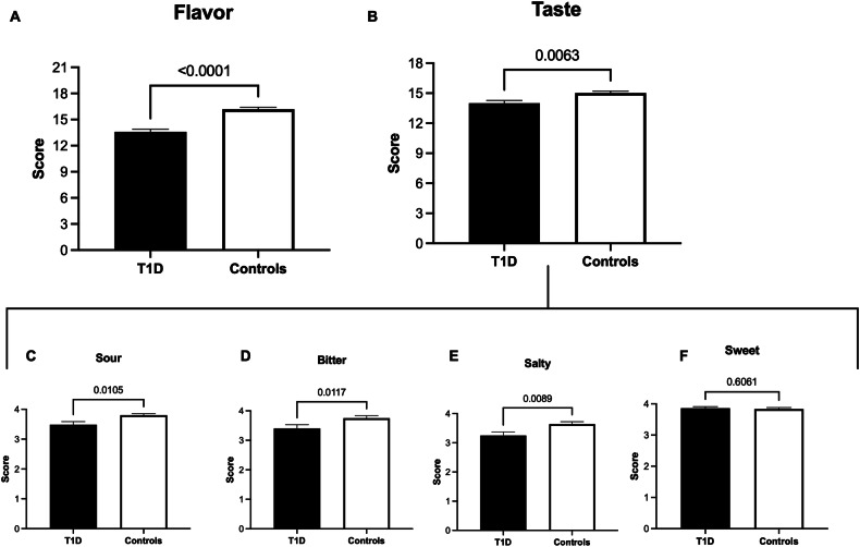Subjects/methods: Seventy-two people with T1D and 72 matched healthy controls participated in the study. Participants underwent the gustometry test for sweet, sour, salty, and bitter tastes and the flavor test, which consisted of oral administration of aqueous aromatic solutions identifying 21 different compounds.