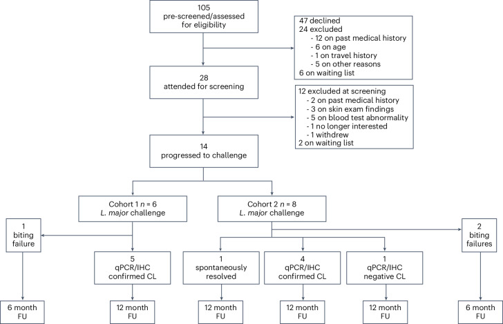 The leishmaniases are globally important parasitic diseases for which no human vaccines are currently available. To facilitate vaccine development, we conducted an open-label observational study to establish a controlled human infection model (CHIM) of sand fly-transmitted cutaneous leishmaniasis (CL) caused by Leishmania major. Between 24 January and 12 August 2022, we exposed 14 participants to L. major-infected Phlebotomus duboscqi. The primary objective was to demonstrate effectiveness of lesion development (take rate) and safety (absence of CL lesion at 12 months). Secondary and exploratory objectives included rate of lesion development, parasite load and analysis of local immune responses by immunohistology and spatial transcriptomics. Lesion development was terminated by therapeutic biopsy (between days 14 and 42 after bite) in ten participants with clinically compatible lesions, one of which was not confirmed by parasite detection. We estimated an overall take rate for CL development of 64% (9/14). Two of ten participants had one and one of ten participants had two lesion recurrences 4-8 months after biopsy that were treated successfully with cryotherapy. No severe or serious adverse events were recorded, but as expected, scarring due to a combination of CL and the biopsy procedure was evident. All participants were lesion free at >12-month follow-up. We provide the first comprehensive map of immune cell distribution and cytokine/chemokine expression in human CL lesions, revealing discrete immune niches. This CHIM offers opportunities for vaccine candidate selection based on human efficacy data and for a greater understanding of immune-mediated pathology. ClinicalTrials.gov identifier: NCT04512742 .