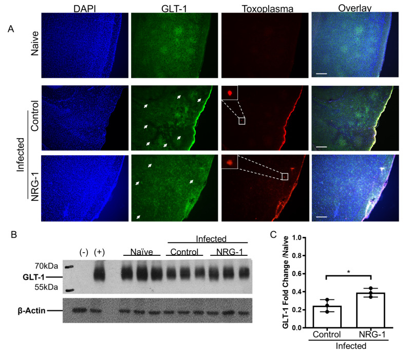 Background: Infection with the protozoan parasite Toxoplasma gondii leads to the formation of lifelong cysts in neurons that can have devastating consequences in the immunocompromised. In the immunocompetent individual, anti-parasitic effector mechanisms and a balanced immune response characterized by pro- and anti-inflammatory cytokine production establishes an asymptomatic infection that rarely leads to neurological symptoms. Several mechanisms are known to play a role in this successful immune response in the brain including T cell production of IFNγ and IL-10 and the involvement of CNS resident cells. This limitation of clinical neuropathology during chronic infection suggests a balance between immune response and neuroprotective mechanisms that collectively prevent clinical manifestations of disease. However, how these two vital mechanisms of protection interact during chronic Toxoplasma infection remains poorly understood.
