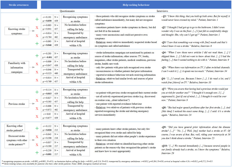 Results: Our hypothesis that stroke awareness would be associated with appropriate help-seeking behaviour at stroke symptom onset was partially supported by the quantitative data, i.e. showing associations between some dimensions of stroke awareness and appropriate help-seeking, but not others. For example, knowing stroke symptoms is correlated with recognising one's own symptoms as stroke (r = 0.101; p = 0.030*; N = 459) but not with no hesitation before calling help (r = 0.003; p = 0.941; N = 457). A previous stroke also makes it more likely to recognise one's own symptoms as stroke (r = 0.114; p = 0.015*; N = 459), but not to be transported by emergency ambulance (r = 0.08; p = 0.872; N = 462) or to arrive at the hospital on time (r = 0.02; p = 0.677; N = 459). Qualitative results showed concordance, discordance or provided potential explanations for quantitative findings. For example, qualitative data showed processes of denial on the part of patients and the important role of relatives in initiating appropriate help-seeking behaviour on patients' behalf.